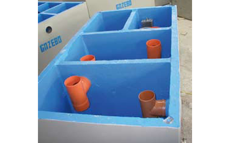 I degrassatori sono dotati di manicotti e raccordi a Tee in PVC sigillati a tenuta idraulica per collegamento tubazioni ingresso e scarico, tubazioni e raccordi a Tee di passaggio intermedi in PVC per collegamento camere, setti divisori in C.A.V. sigillati a tenuta idraulica per realizzazione comparti interni di trattamento.