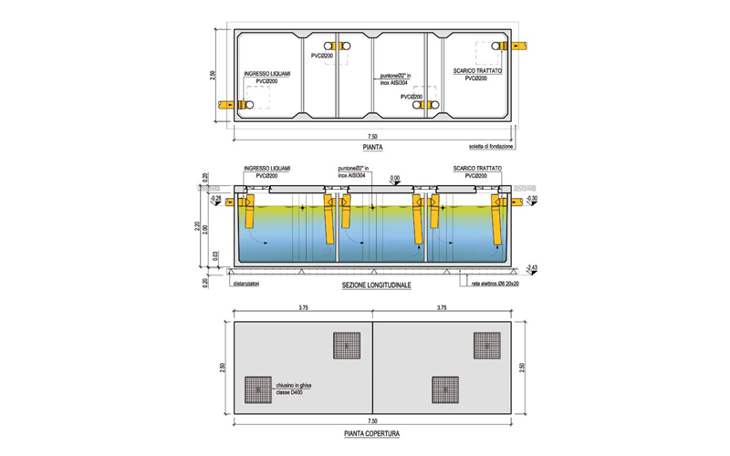 Rivestimenti specifici superfici interne ed esterne vasca, coperture pedonali/carrabili, chiusini in ghisa sferoidale, predisposizioni per installazione in presenza di falda acquifera sotterranea.