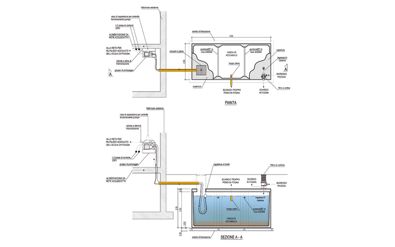 La tipologia proposta abbina lo stoccaggio delle acque piovane in adeguata vasca di accumulo con sistemi per il filtraggio quale filtro a vortice da interro ed il riutilizzo a mezzo gruppo di pompaggio con pompa centrifuga multistadio autoadescante oppure con elettropompa sommergibile e relativi accessori per il corretto funzionamento.